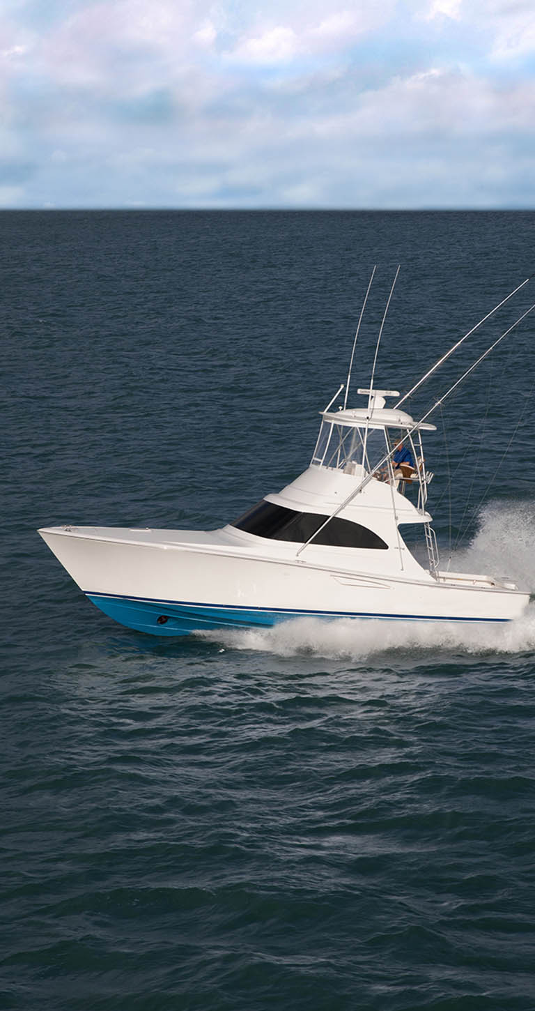 As Viking continues to develop the Billfish series, our building methods and materials have gained efficiency, which adds even more value to these boats. A modified vinylester resin is used in the entire hull skin. End-grain balsa and closed-cell foam are used as coring materials in selected areas for optimized strength and stiffness while minimizing weight. The single integral fiberglass fuel tank, sealed to the hull with resin foam, is resin infused with balsa coring on all sides for stiffness. The hull-to-deck joint is mechanically fastened every three inches and fiberglassed inside.