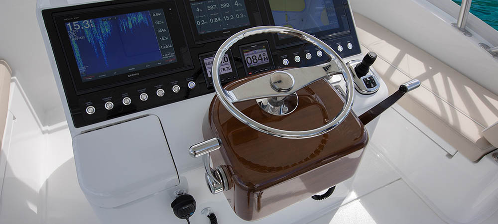 Like her convertible brethren, the 38 Billfish’s flybridge is designed with a tournament-style center console walk-around helm. The 38 Billfish has Palm Beach-style controls and electronic power steering. Seating includes a single Release Marine teak chair (a second helm chair is optional) and lounges to port and starboard and a forward console seat. A three-sided Costa Clear enclosure provides weather protection and gin-clear visibility. Our subsidiary Atlantic Marine Electronics can build and install an A-to-Z package of navigation and communication equipment to deliver the boat turnkey ready.