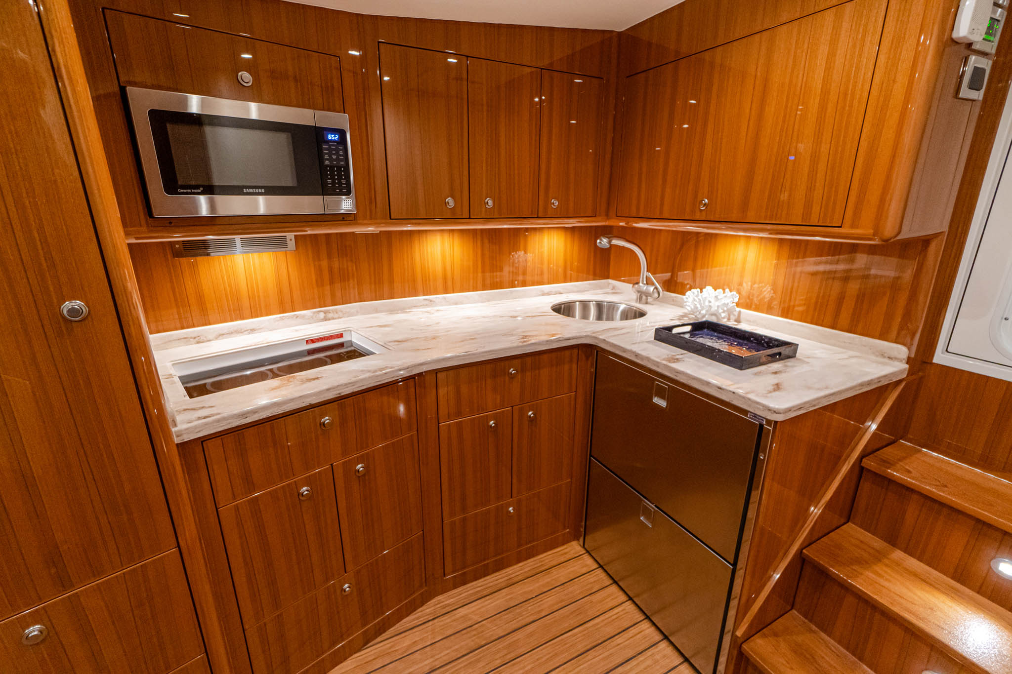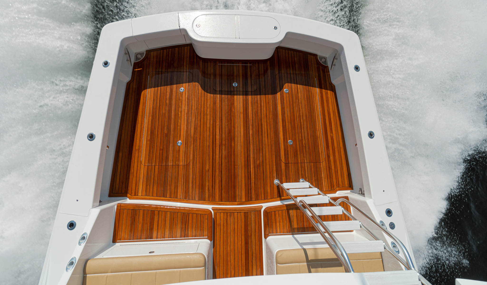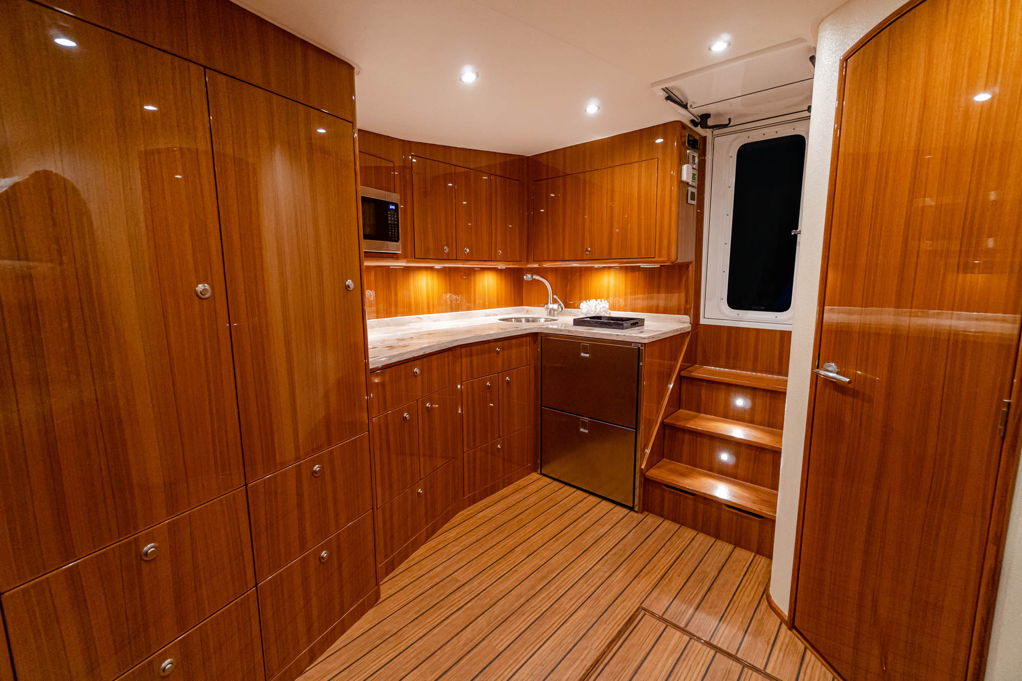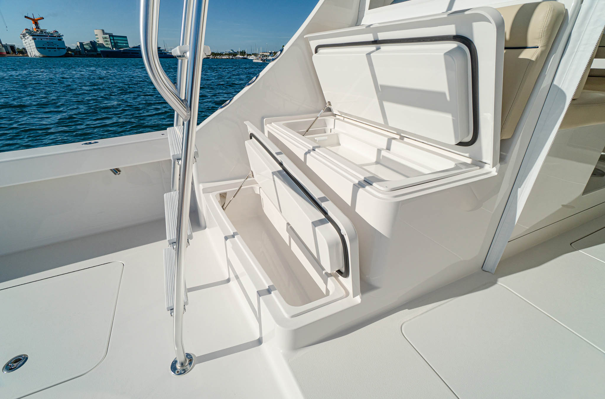 The 140-square-foot cockpit has room for the entire crew or family. The cockpit sole is built with a laminated in-deck mounting plate for fighting chair, rocket launcher or table installations. Standard equipment and features include a cockpit bait freezer with upper tray, in-deck insulated fish boxes port and starboard with overboard drainage, a walk-through transom door and lift gate, a transom fish box and live well, rod holders, tackle storage and fresh and sea-water wash downs. Two-person, mezzanine-style seats flank the centerline walkthrough, and there’s refrigerated drink storage in the starboard mezzanine step, as well as ample general stowage throughout.