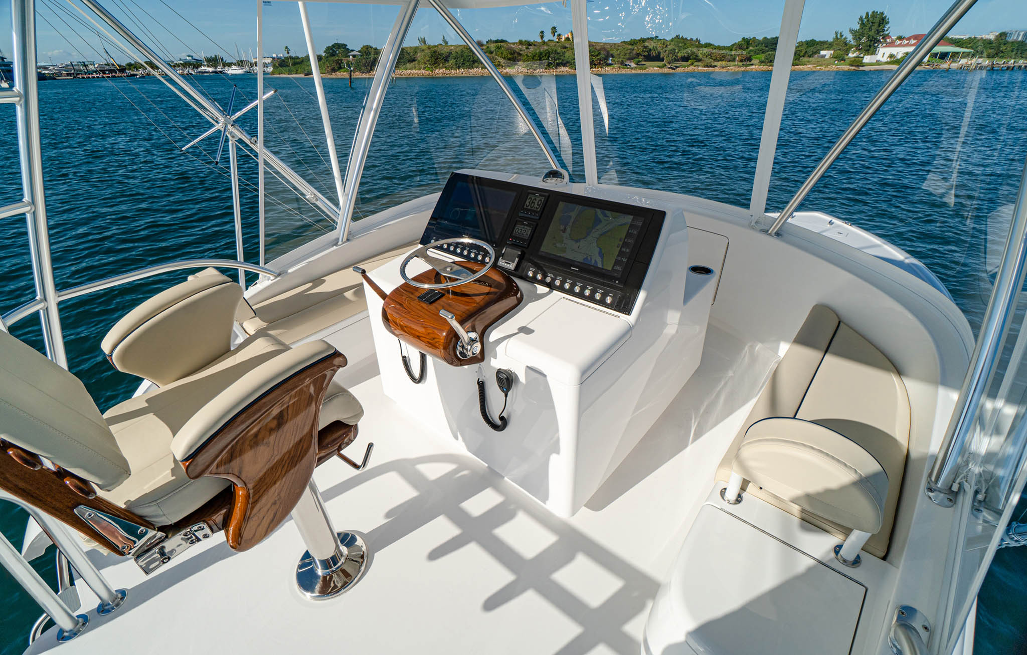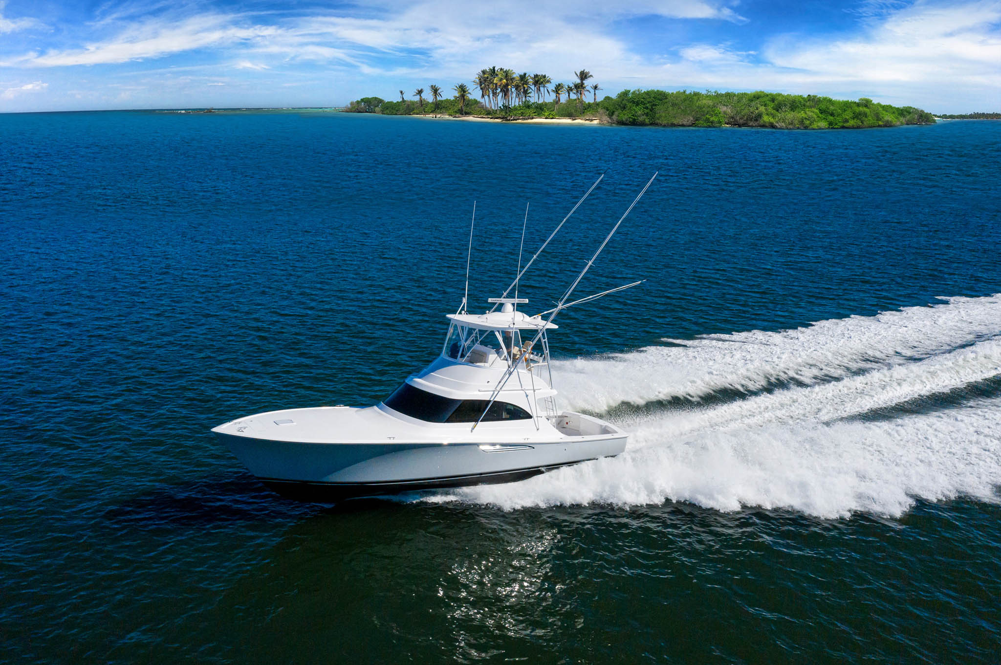 Like our legendary Viking convertibles, the 46 Billfish’s flybridge is designed with a tournament-style center console walk-around helm. The 46 Billfish has Palm Beach-style controls and electric power steering. Seating includes a single Release Marine teak chair (a second helm chair is optional) and lounges to port and starboard and a forward console seat. Our subsidiary Atlantic Marine Electronics can build and install a complete package of navigation and communication equipment to deliver the boat turnkey ready.