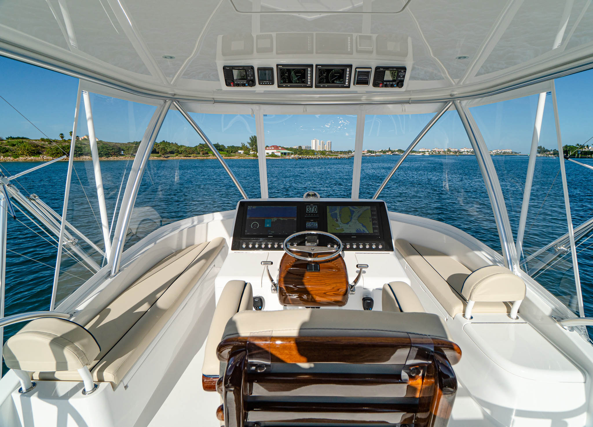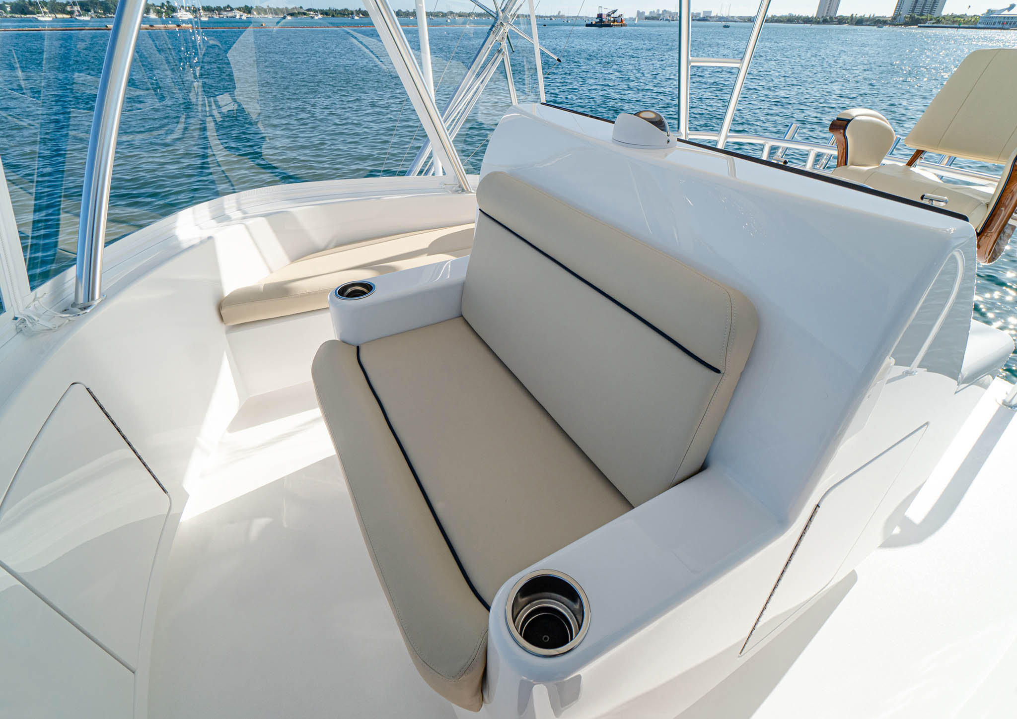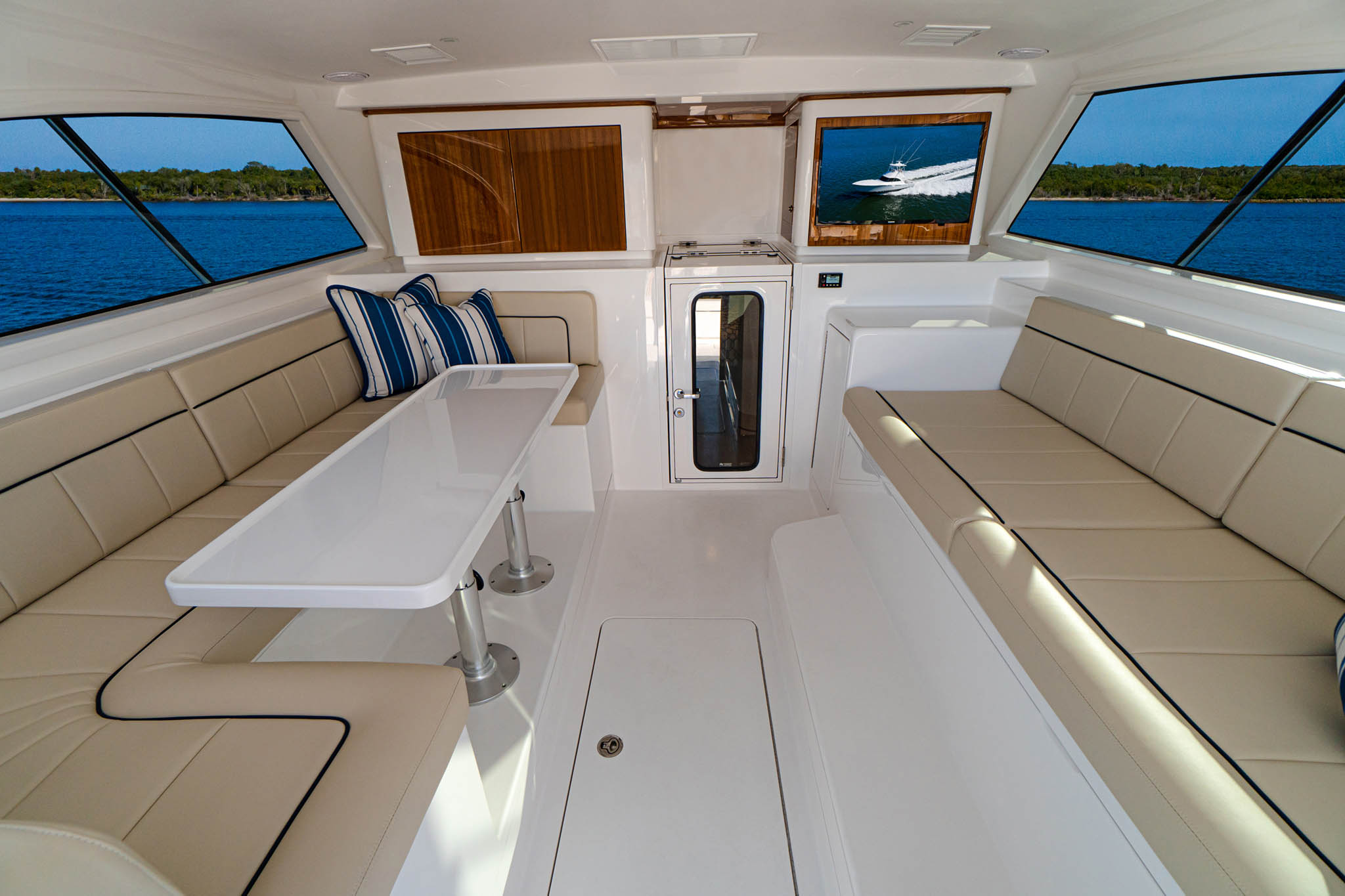 The 46 Billfish’s command deck can be completely enclosed and is climate-controlled. “It’s perfect for anglers who want to get off their feet and cool down as the boat moves from one spot to the next,” says Viking Design Manager David Wilson. The command deck features a salon-like living area with a roomy U-shaped lounge and hi-lo table and a lounge that extends along the starboard side. Both seating areas hold rod storage underneath.
