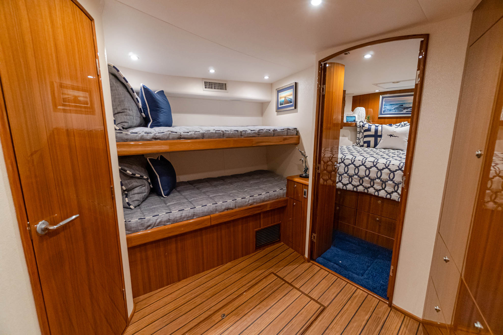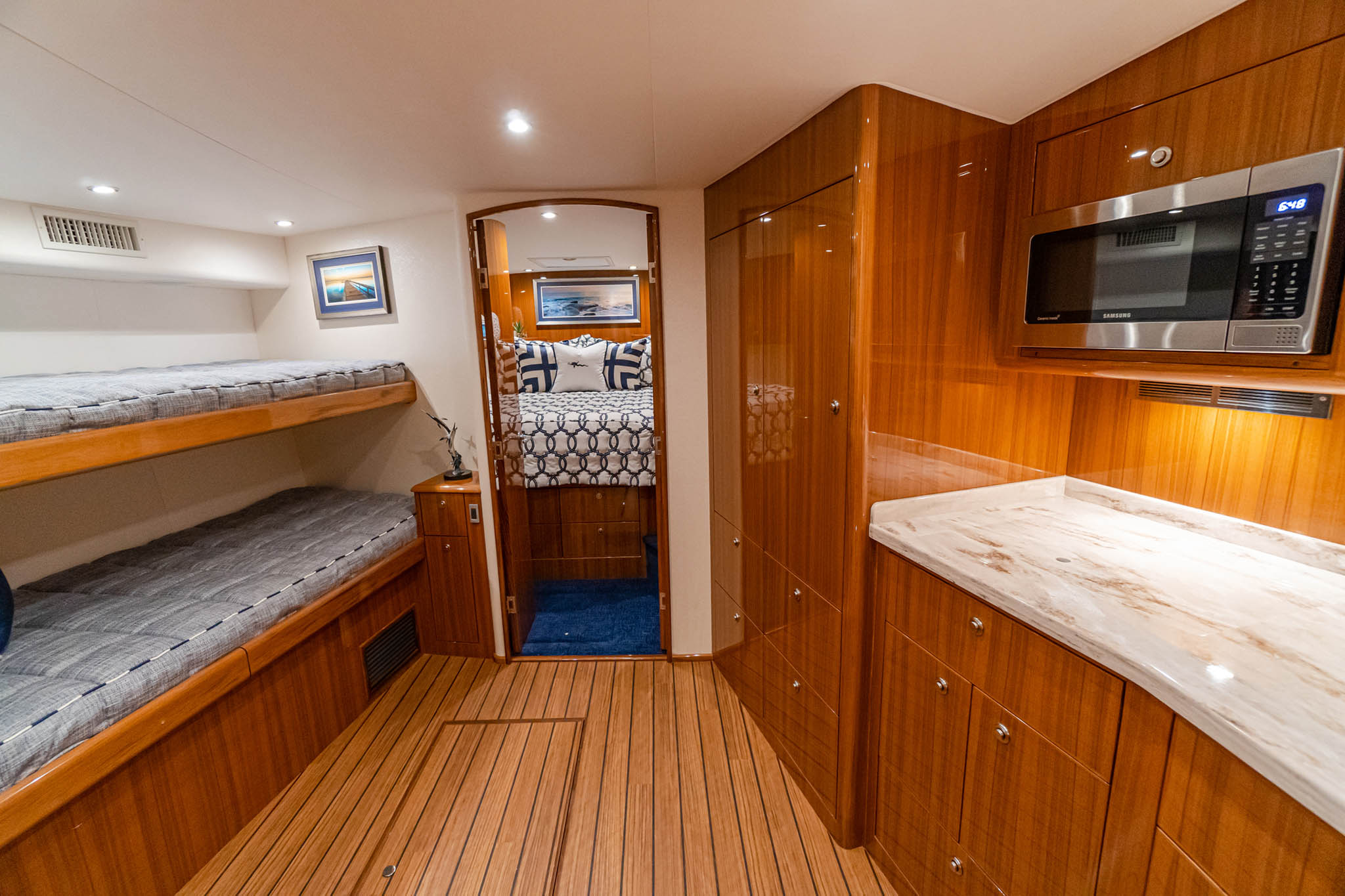 Rest up and recharge in the 46 Billfish’s air-conditioned cabin. Featuring high-gloss teak cabinetry and custom Amtico flooring, the fully appointed starboard-side galley has an L-shaped Corian countertop, a two-burner electric stove, a microwave/convection oven, cabinet storage and under-counter drawer-style refrigeration with a built-in ice maker. The private head, which is conveniently located immediately to port of the companionway stairs, has a large walk-in shower with satin nickel fixtures, an attractive Corian-topped vanity with sink and storage and a medicine cabinet with mirrored doors. Easily accessible upper and lower bunks on the port side await weary anglers, and there’s a hanging locker only a few steps away. The first-class accommodations continue in the private forward stateroom, with its island queen bed, a hanging locker, upper storage cabinetry and an HDTV with stereo and speakers.