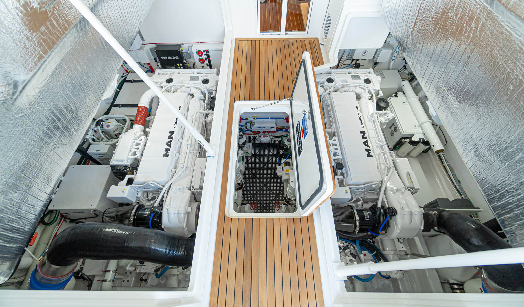 The engineroom, lazarette and forward bilges are painted with Snow White Awlgrip for increased visibility and ease of maintenance. A large centerline hatch gives you quick access to the engines and optional Seakeeper SK 6 gyro. Twin Cummins QSM11 715MHP diesels provide the standard power for the 46 Billfish, with three options: twin MAN 800MHP or 850MHP engines or Scania 900MHP engines.