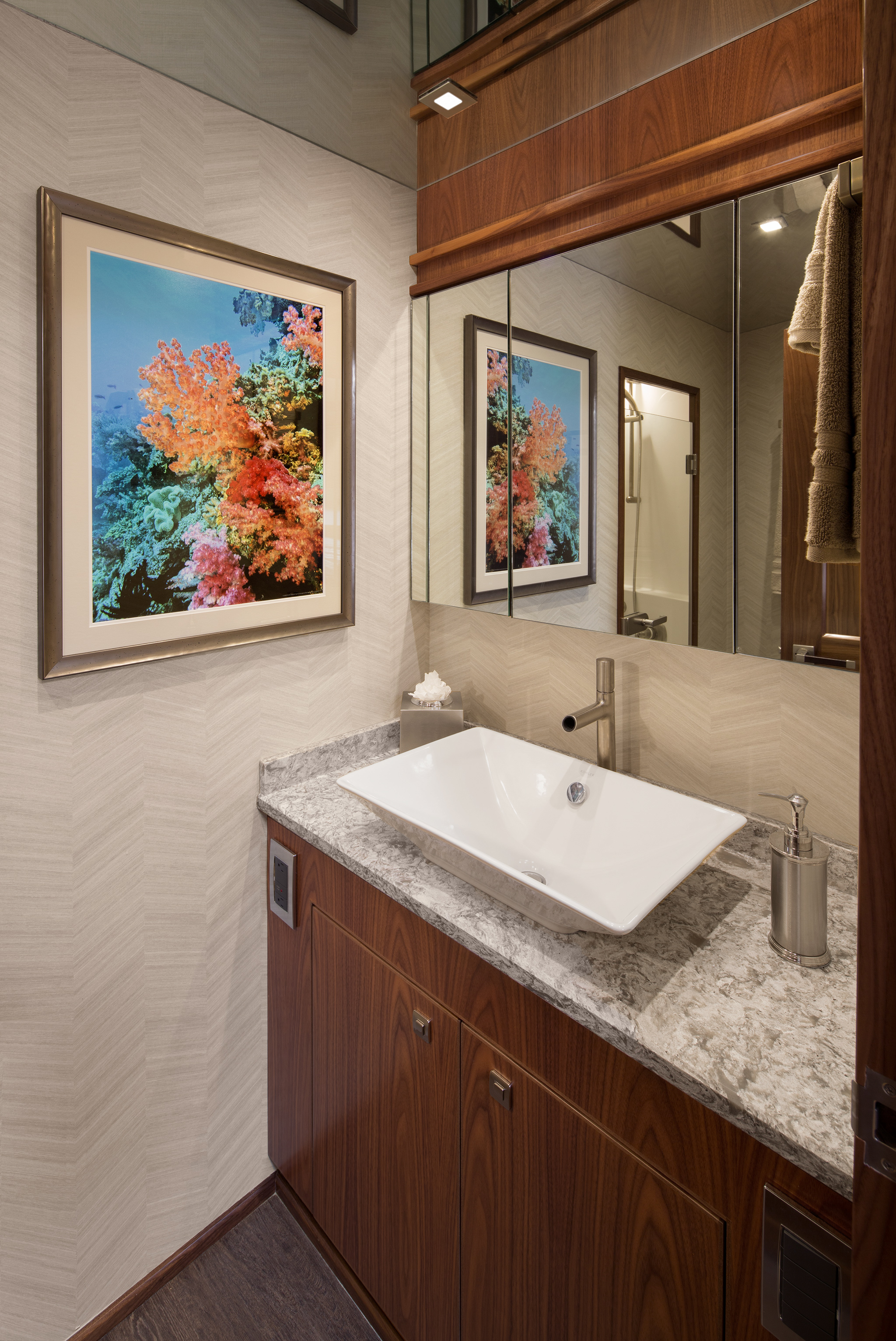 The Viking 82’s larger size can also be seen in the forepeak, where you’ll find five generously appointed staterooms and additional space in the companionway for a dedicated rod and tackle locker as well as a laundry center. The latter features a full-size stackable washer and dryer with centralized control panel for easy operation. The rod and tackle locker can be customized to the owner’s liking. Beautiful walnut doors conceal both of these spaces.